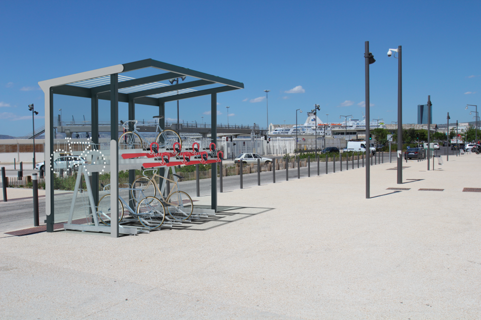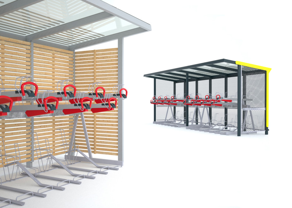 Galvanisert stål med pulverlakkering. Bak- og sidevegger av herdet glass med sykkel-piktogram, av trespiler i lerk eller av strekkmetal plater.