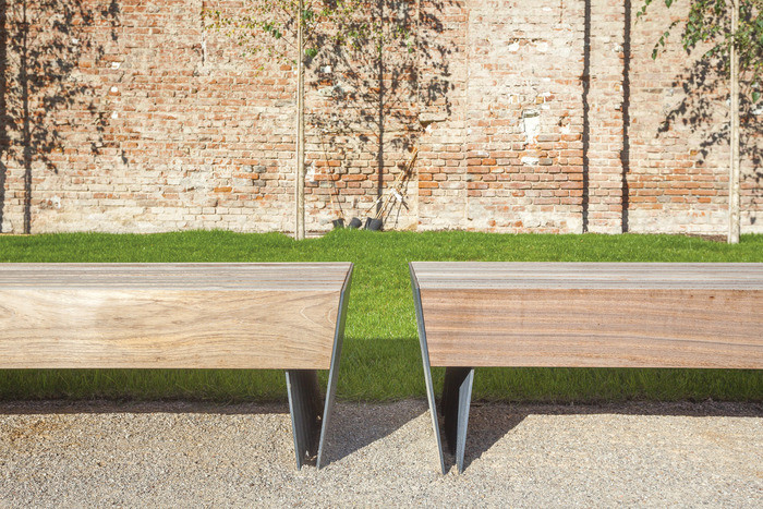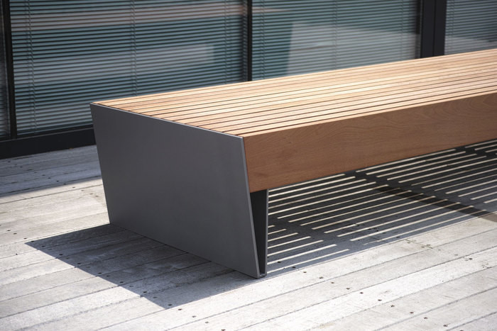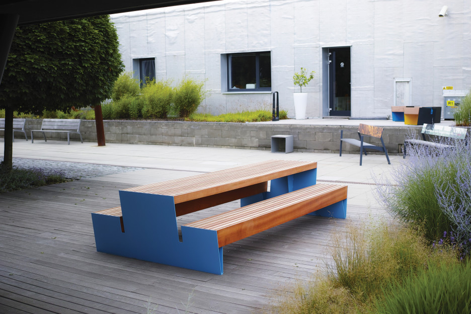 Blocq-serien inneholder benker og picnic-bord med massive trespiler som støttes av stramt formete stålvanger.