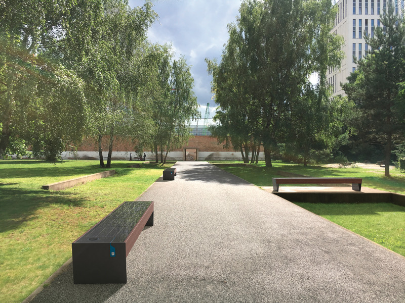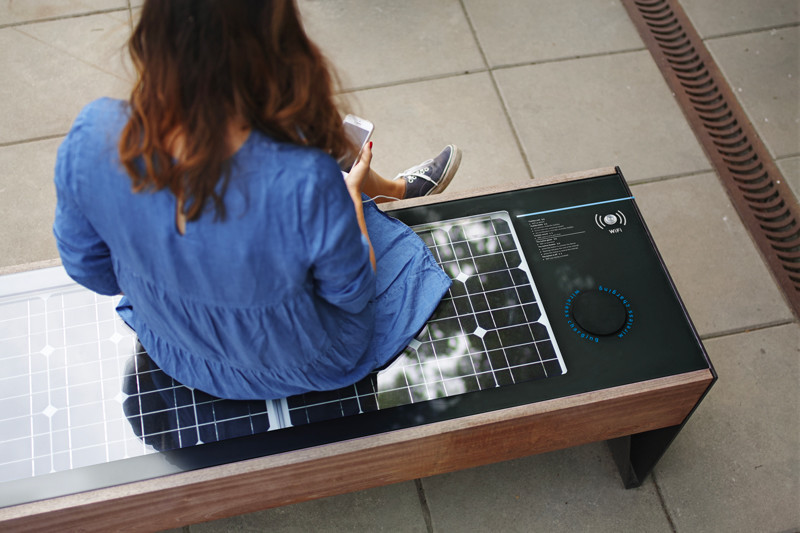 Blocq Solar er en benk som virkelig blir lagt merke til. Stor, massiv benk med kontrastfylte ben av bøyde stålplater med spiss form, samt glitrende solcelle på setet under sikkerhetsglasset. Den tilbyr mange sitteplasser og praktiske ladepunkter for mobilt utstyr vi er vant å ha med oss overalt. Lading skjer via USB og trådløst Qi-lading for utstyr som støtter dette. Benken kan også leveres utstyrt med wifi hotspot.