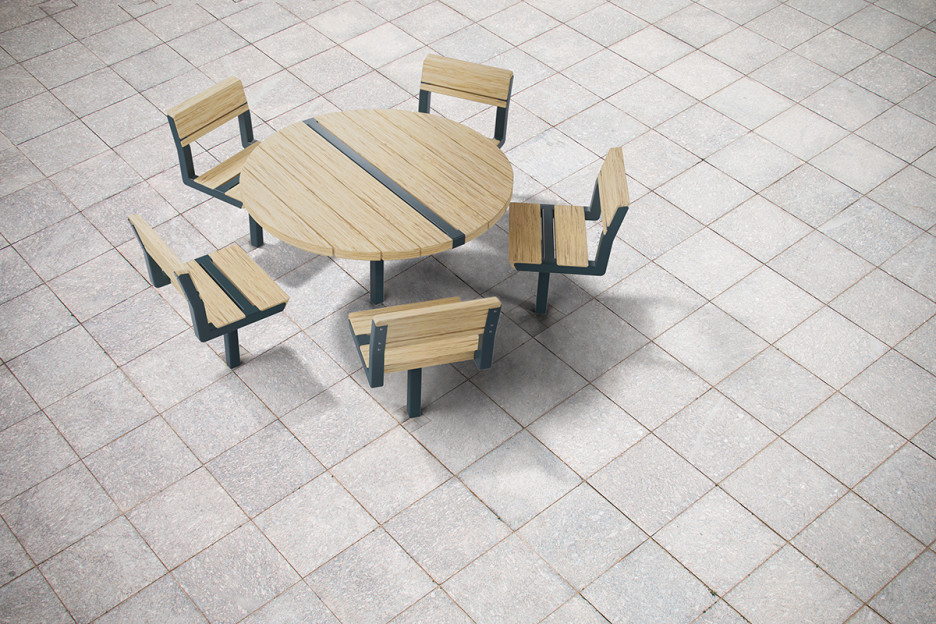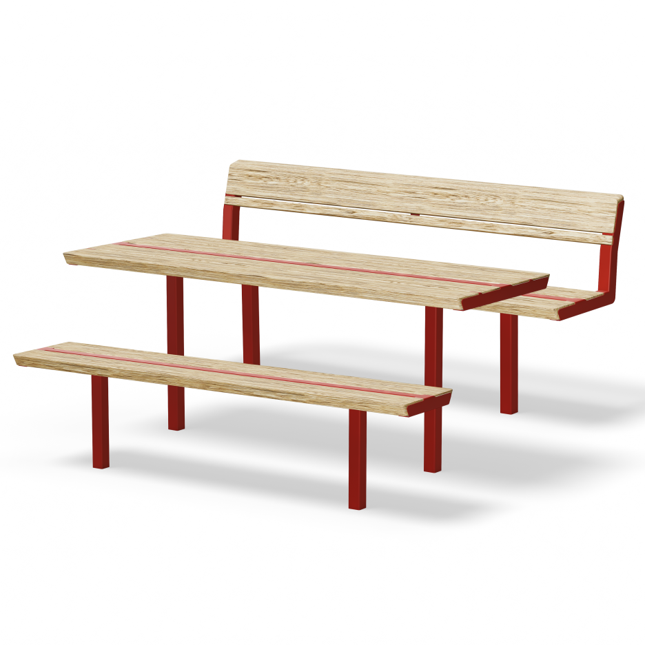 Møbelserien inkluderer stoler, benker, sofaer og bord. Konstruksjonen er solid med en ramme av stål og solide planker av svensk furu, og sittemøblene er tilgjengelige både med og uten gripevennlige armlener.