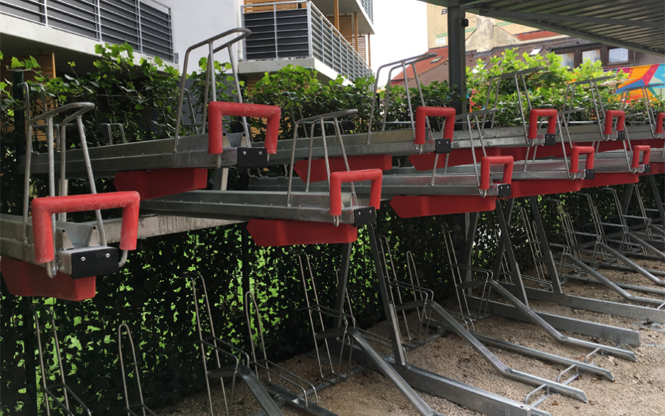 Systemet benytter integrerte gassfjærer som hjelper deg med å løfte sykkelen opp på det øverste parkeringsnivået. Et unikt system med dempere gir en sikker, kontrollert og håndfri nedtaking når du skal ha igjen sykkelen. Dette gjør det mye lettere å parkere sykkelen på det øverste nivået.