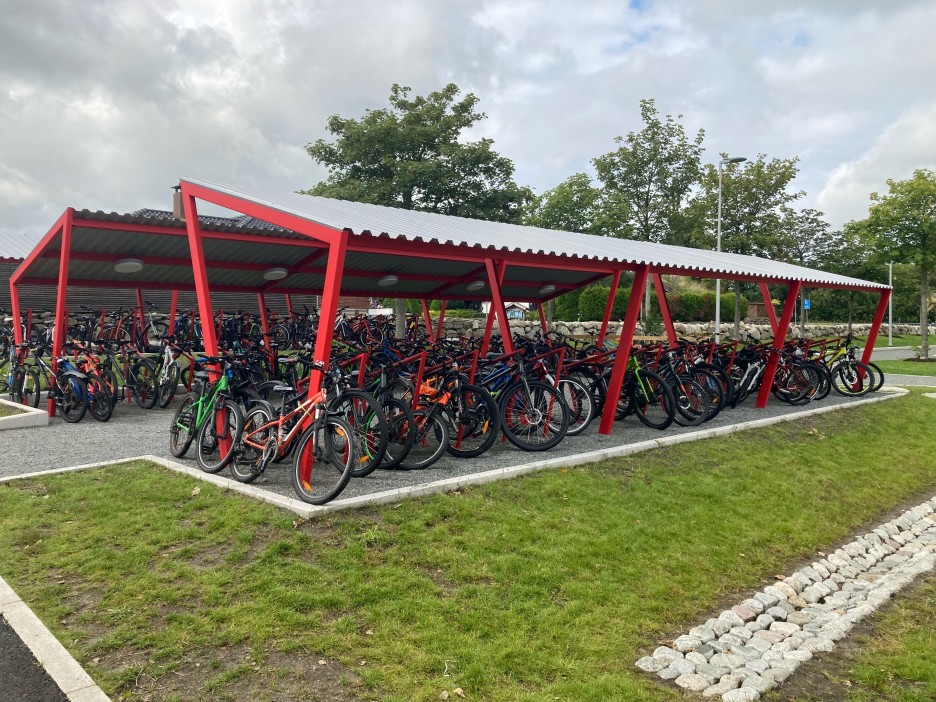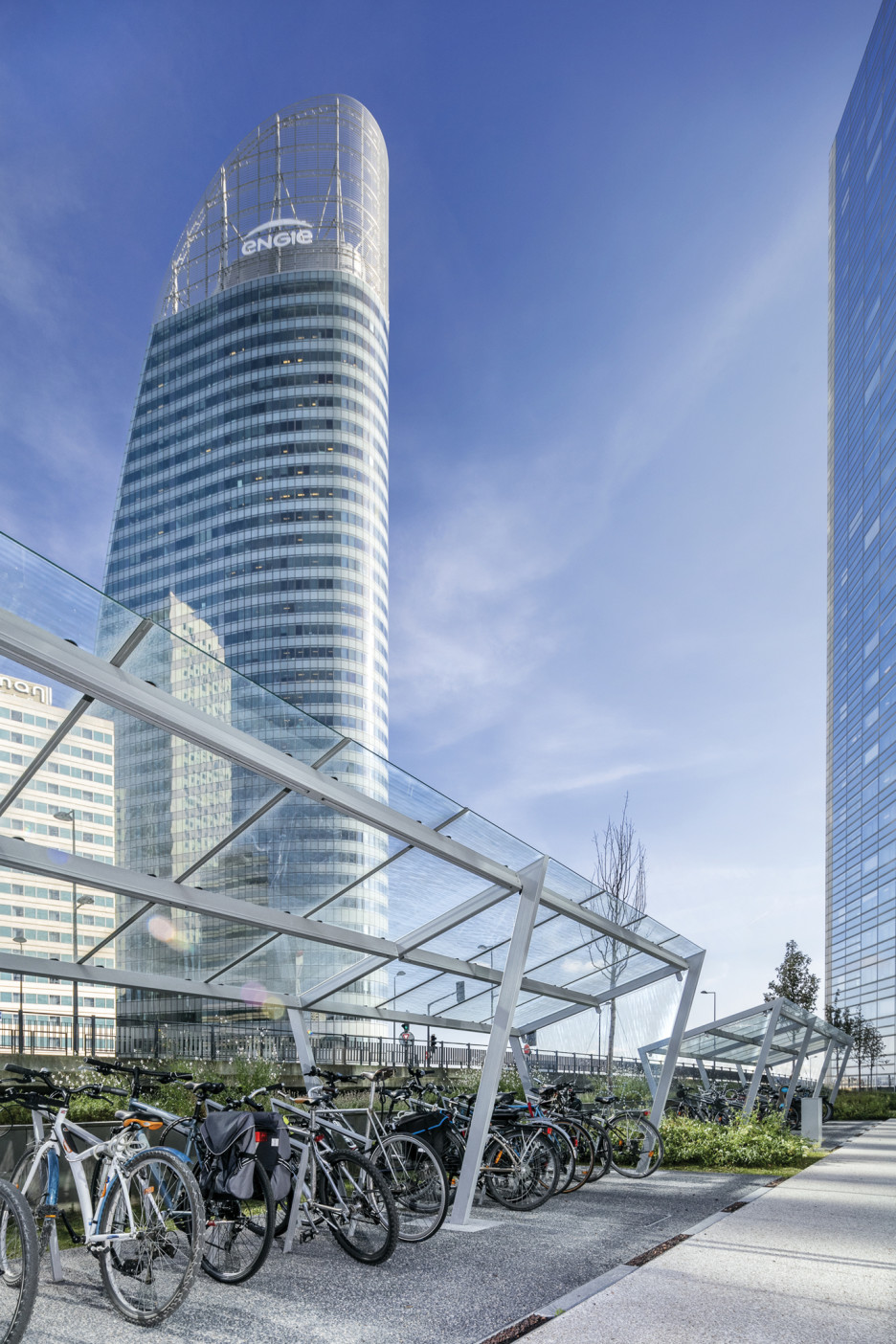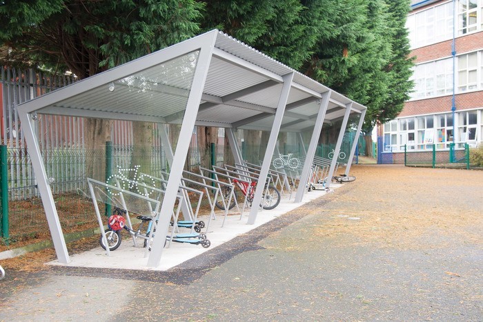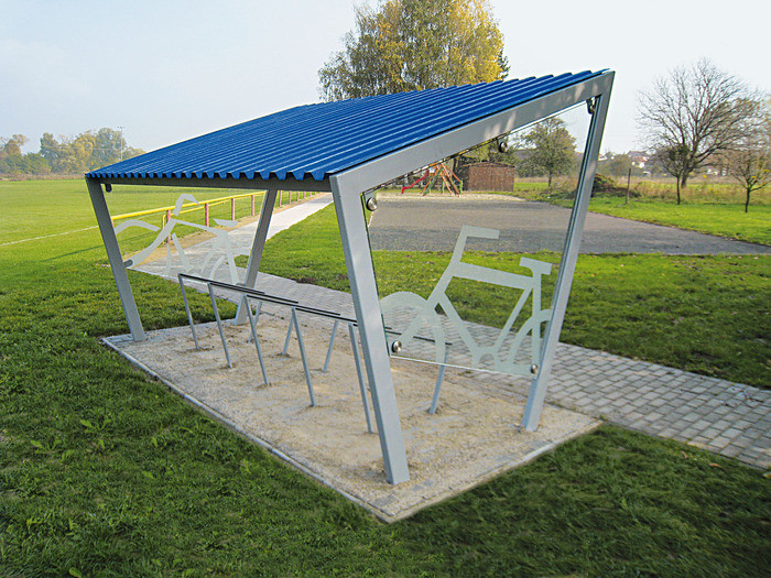 EDGE sykkeloverdekning har en elegant og dynamisk form. Robust ramme i kombinasjon med glass skaper en interessant kontrast og ly for syklene.