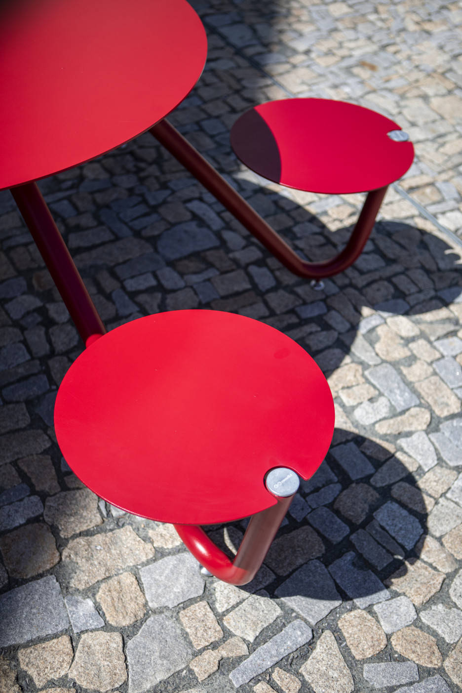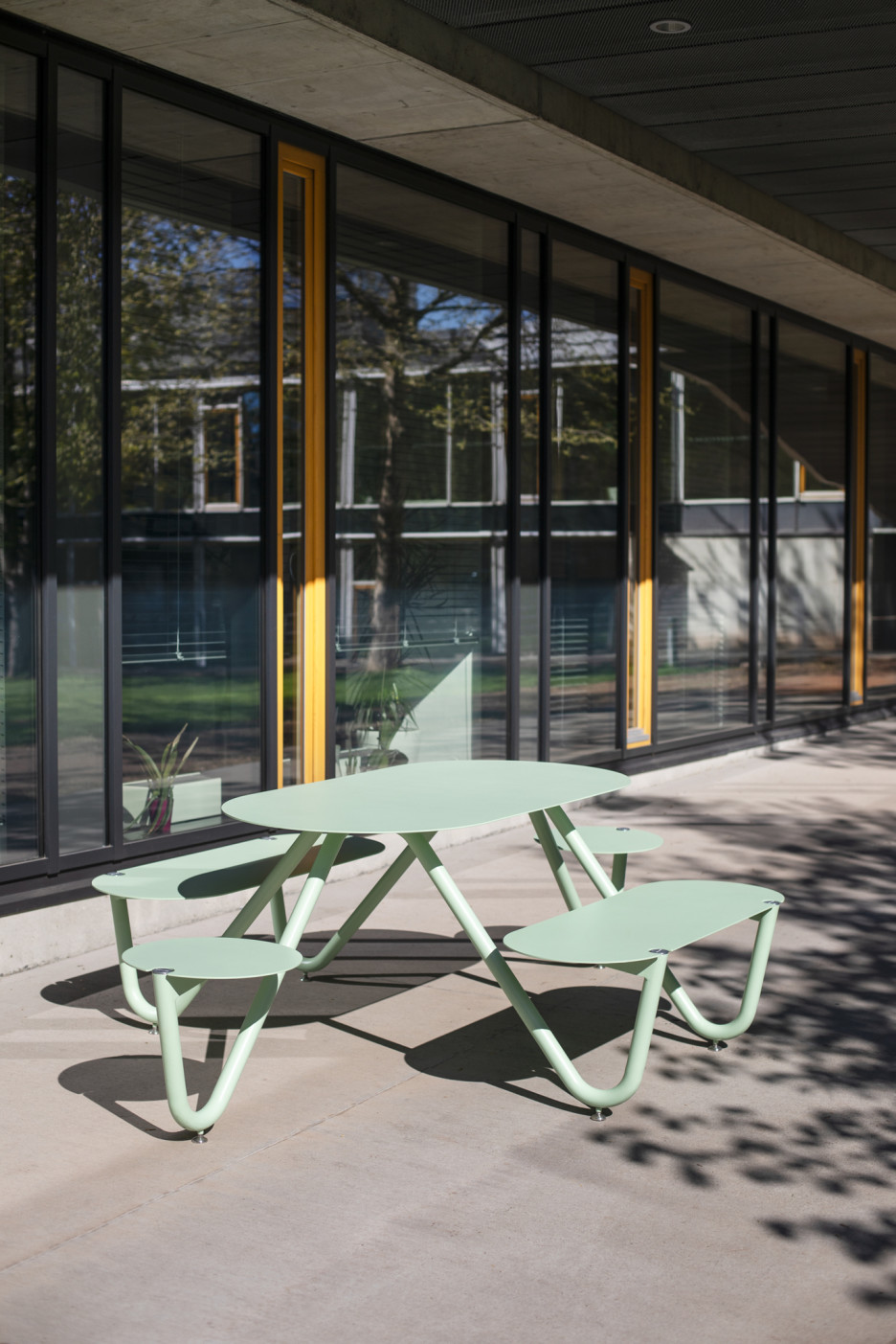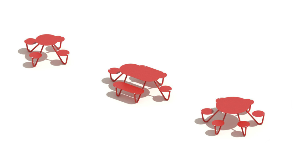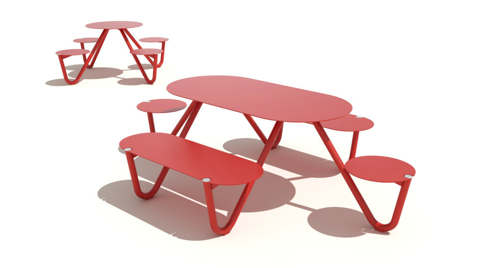 Leveres med runde eller ovale bord, for 4 eller 6 sitteplasser. Kan stå som frittstående med justerbare ben eller boltes på underlaget via hull under bena. Bordplaten leveres enten i lakkert stål eller HPL (høytrykkslaminat). Setene er i stål.