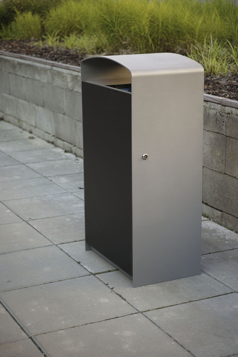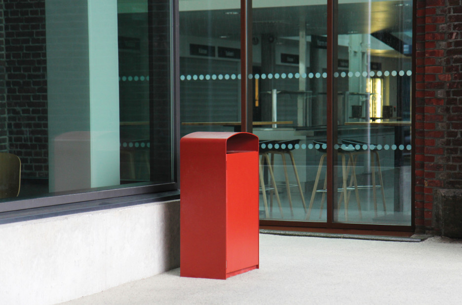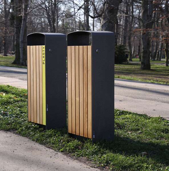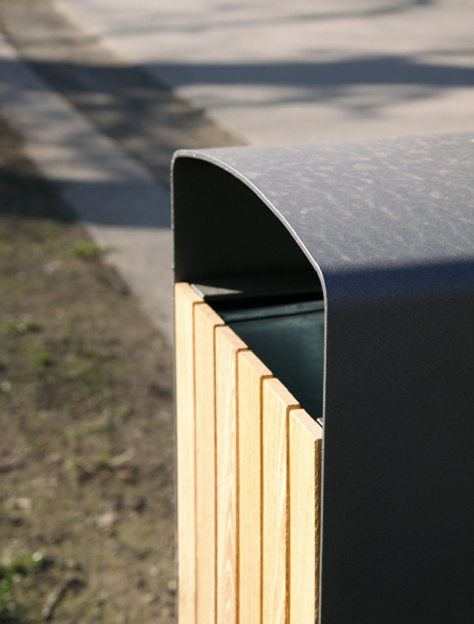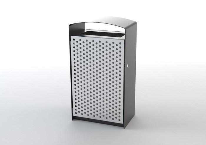 Prax avfallsbeholder med stålramme og mykt avrundet topp gir et moderne men klassisk form. Låsbar dør med solide trelameller eller med perforert stålplate . Prax avfallsbeholder har en enkel elegans som passer i de fleste by- og parkmiljøer. Den indre avfallsbeholderen er i galvanisert utførelse og rommer 45 L, mens de større modellene er utstyrt med søppelsekk holder for å lette tømming