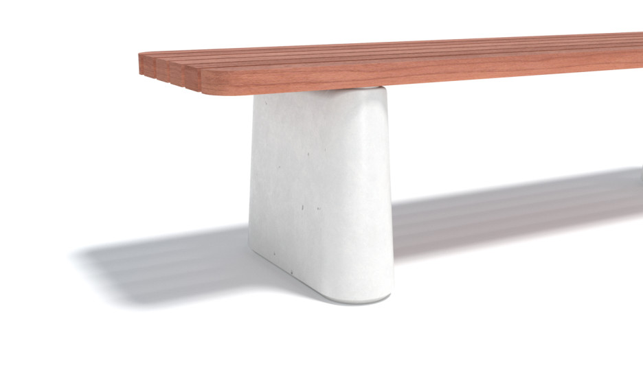 Trespilene leveres enten i varmebehandlet ask (Thermoask), akasia (europeisk, aka robinia) eller FSC godkjent Jatoba. Spilene er montert enten tvers- eller langsgående på benkene. Ben av HSC betong (High strength concrete). Betongdelene enten i lys eller mørk grå farge.