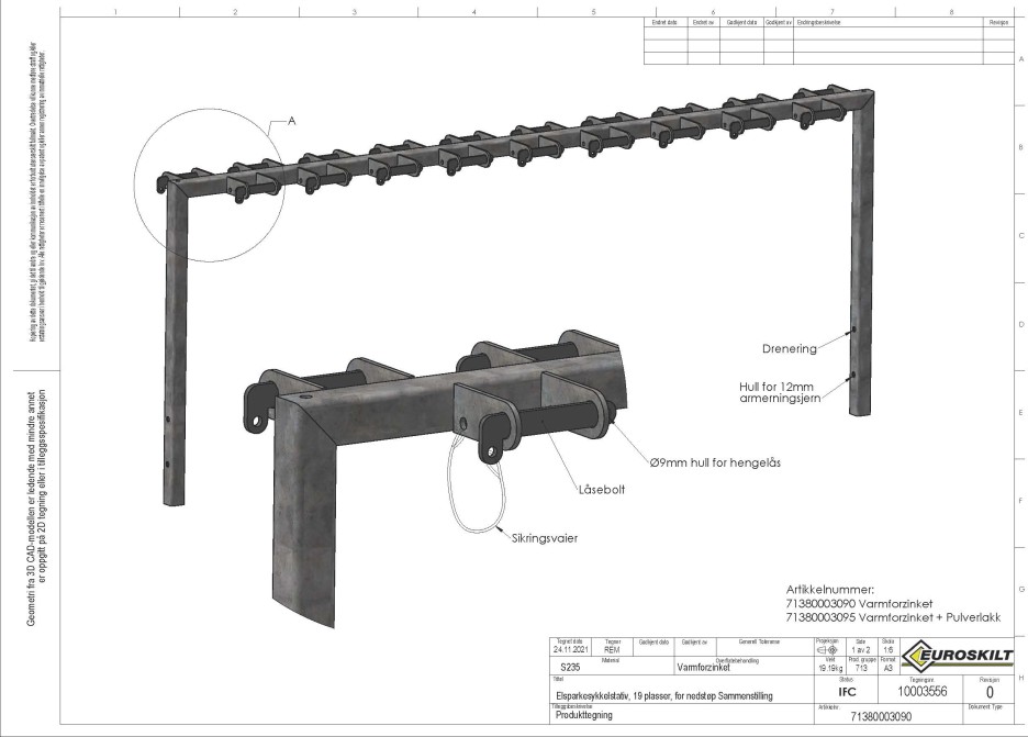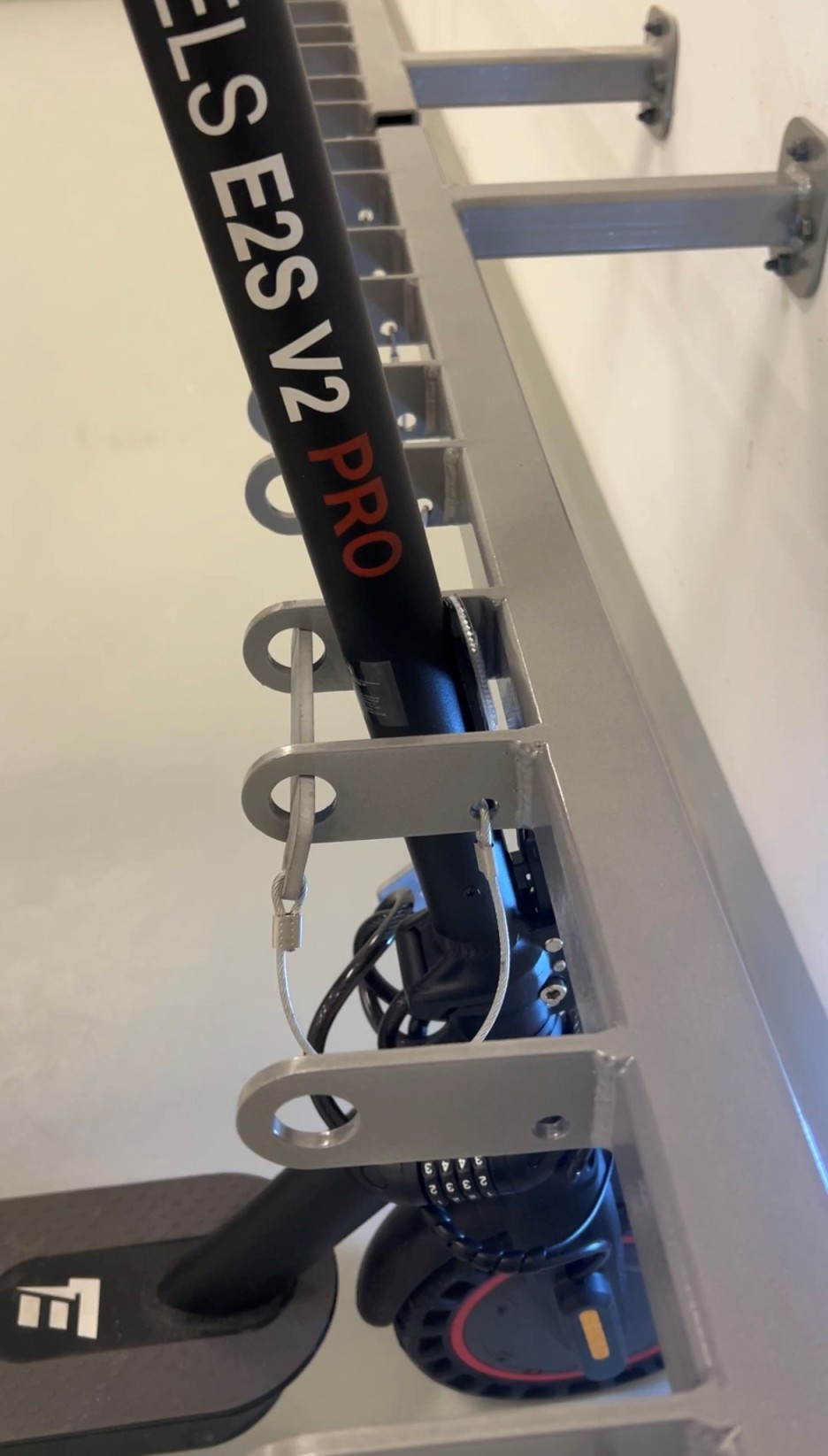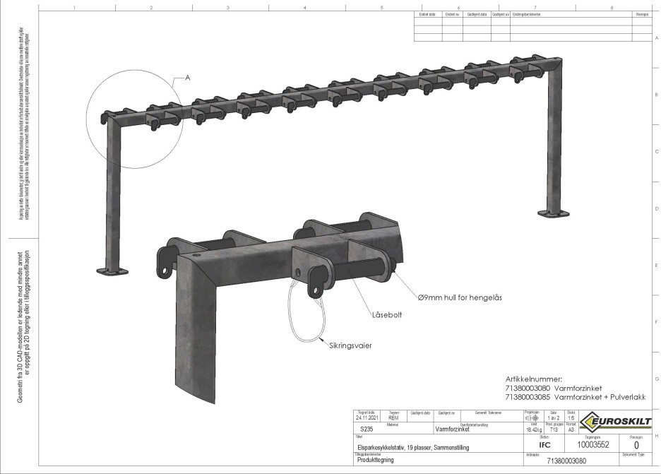Det er plass til 10 stk (1-sidig) eller 19 stk (2-sidig) sparkesykler på stativet for overflatemontering eller nedstøping.
