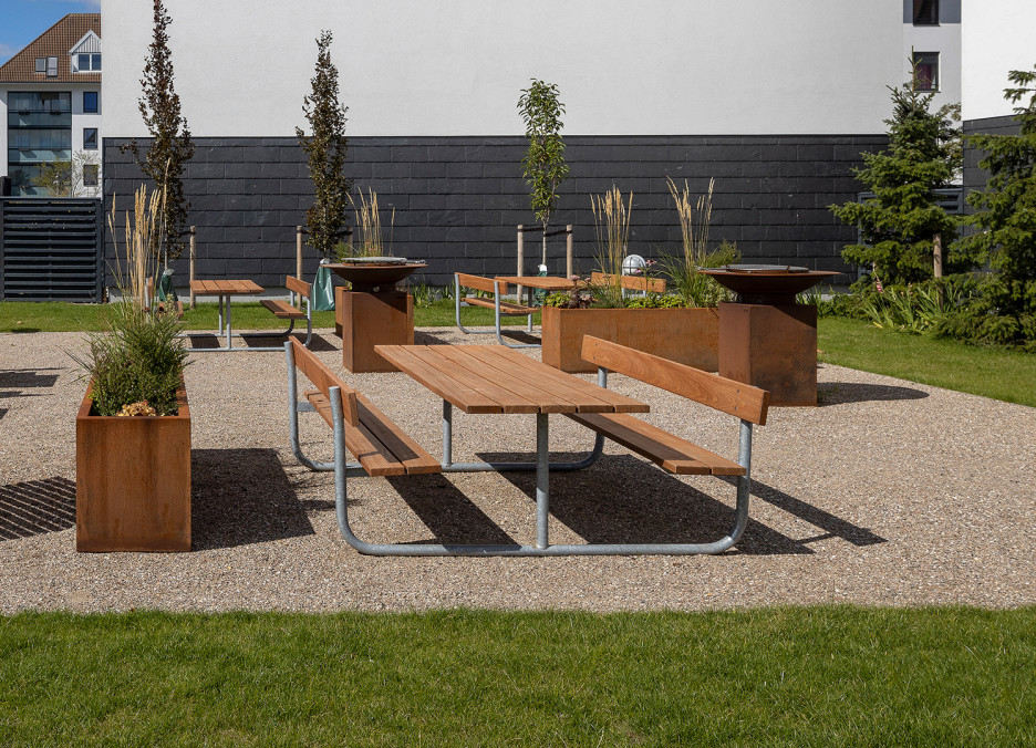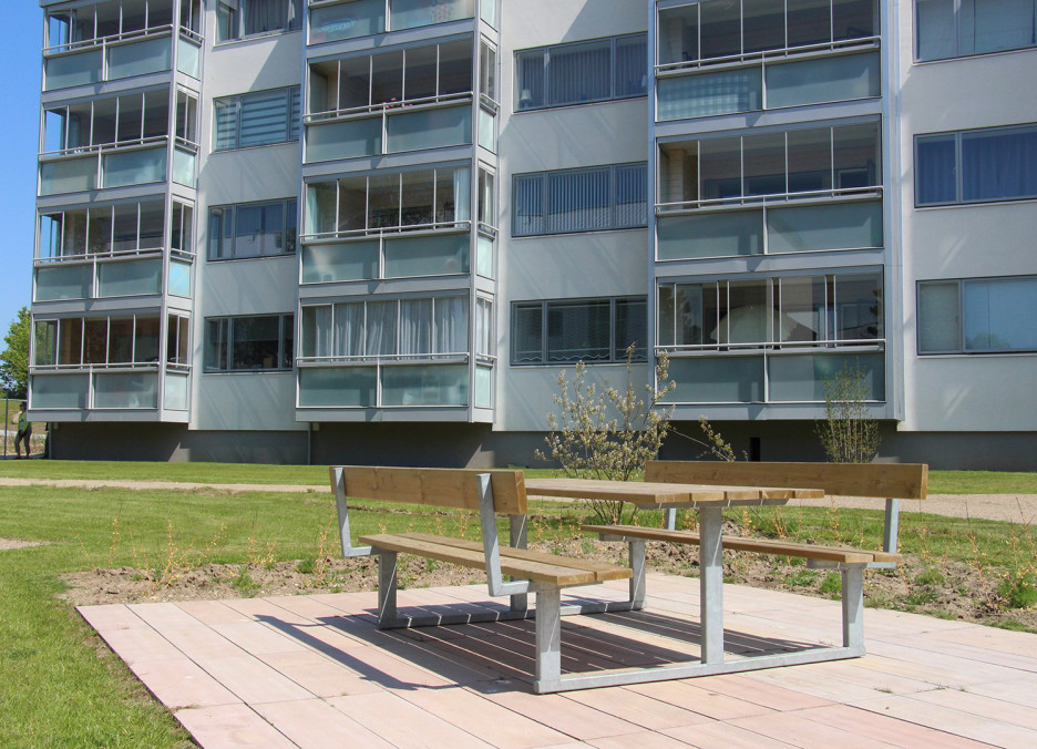 Siesta er en serie med picnic-løsninger for hyggelig stunder og pauser i parker, gårdsplasser, skolegård og andre uterom hvor det er behov for samlingsplasser.