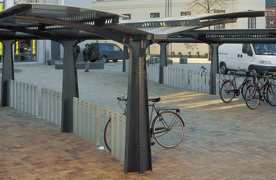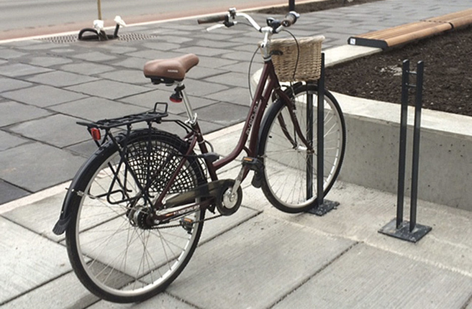 Plassbesparende sykkelstativ med dobbeltsidig parkering til nedstøpning eller fotplate.