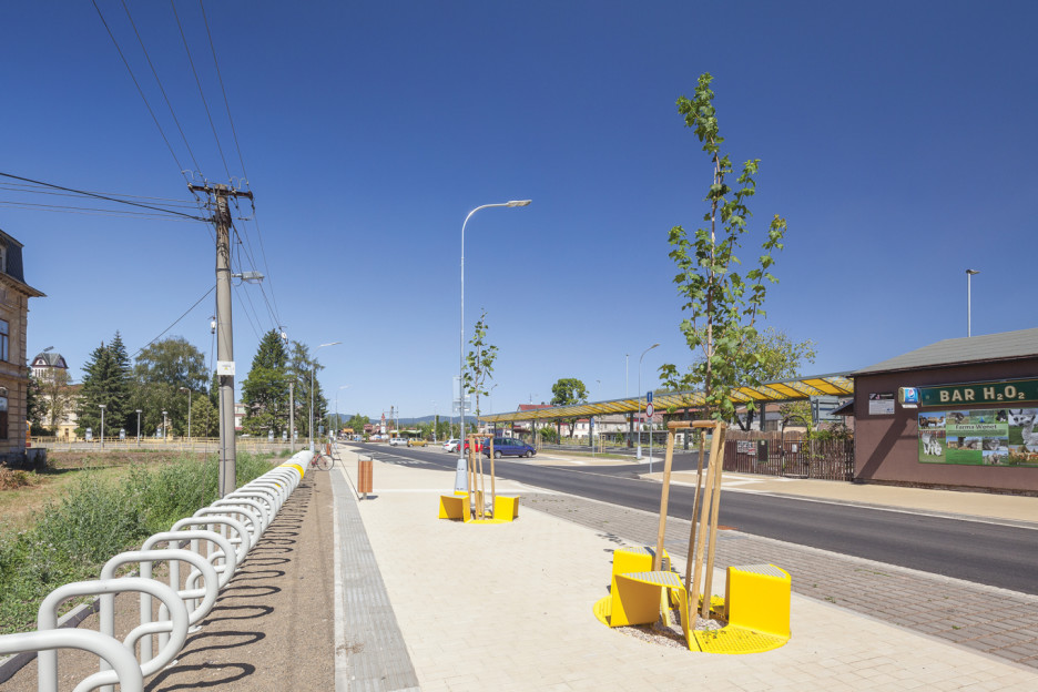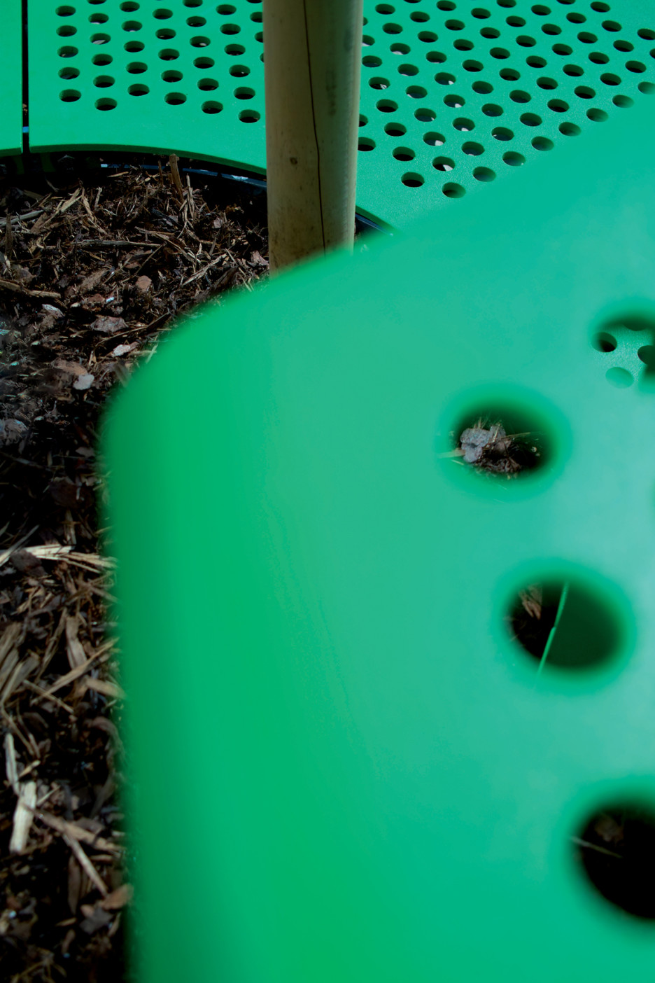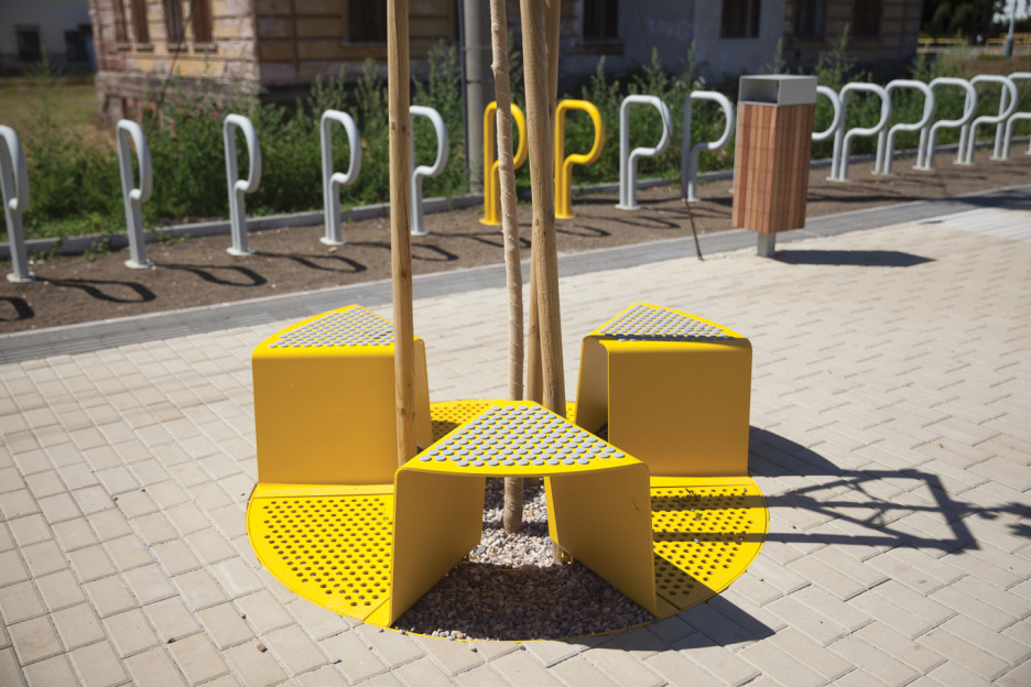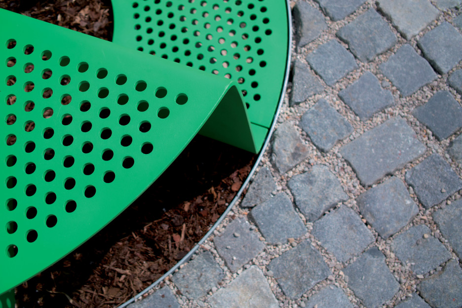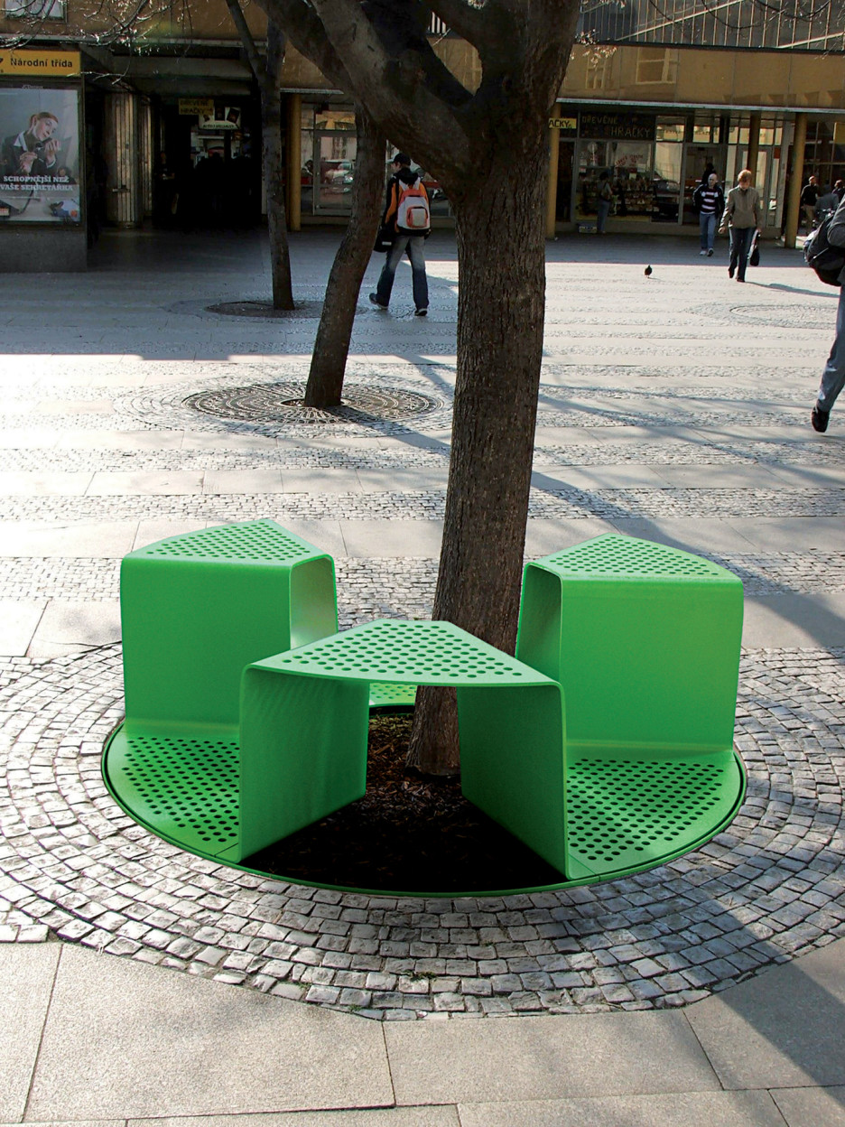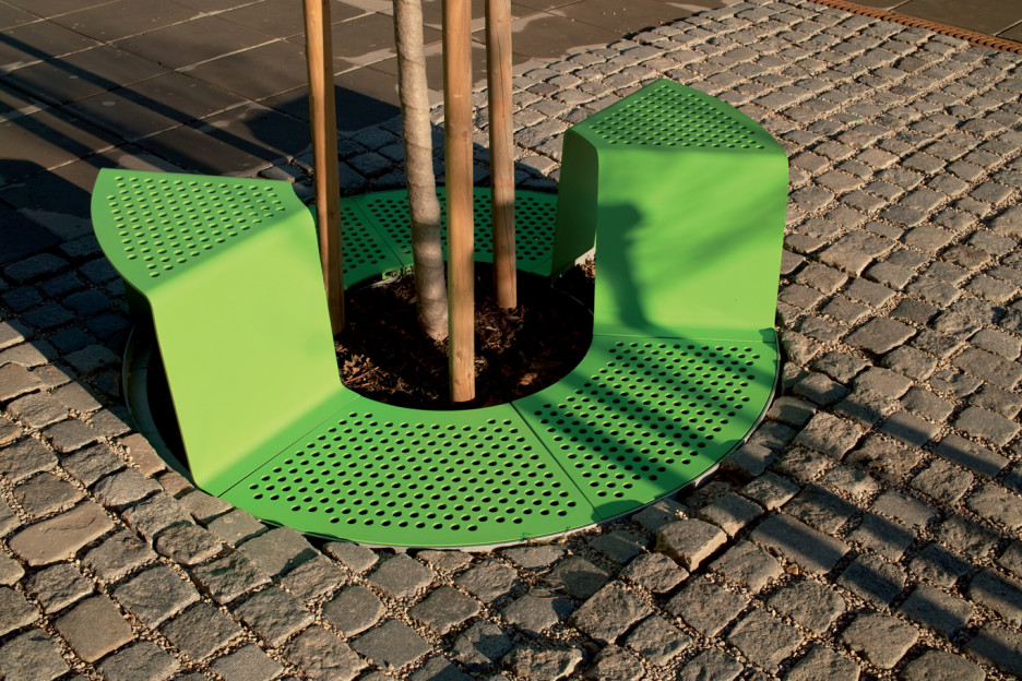 Sinus-stammevern modulene skaper hyggelige sitteplasser rundt trærne, og samtidig holder trafikken unna