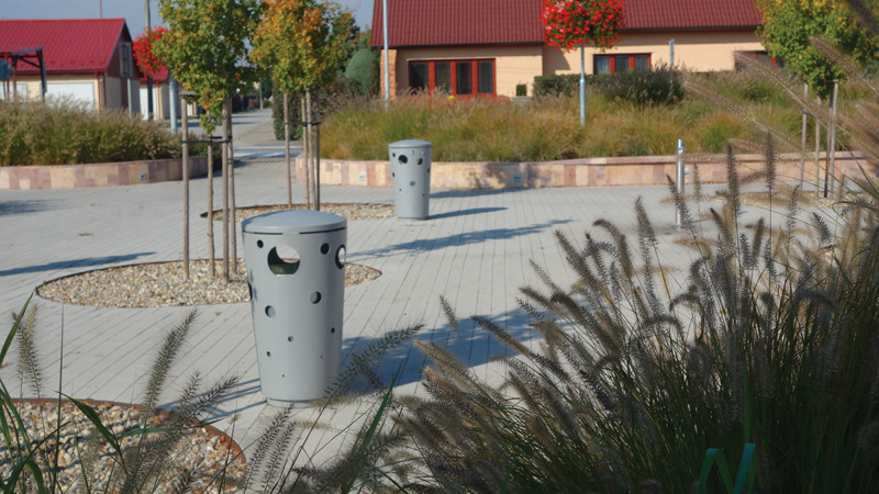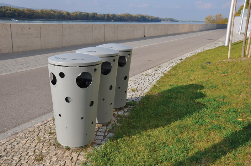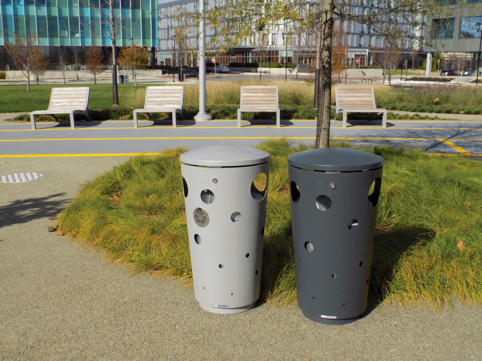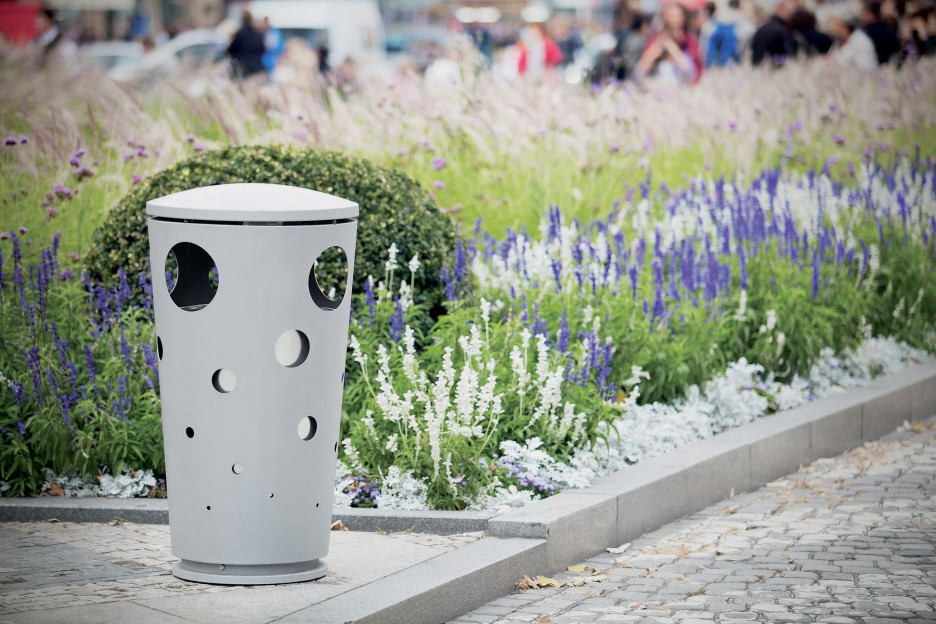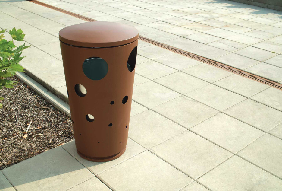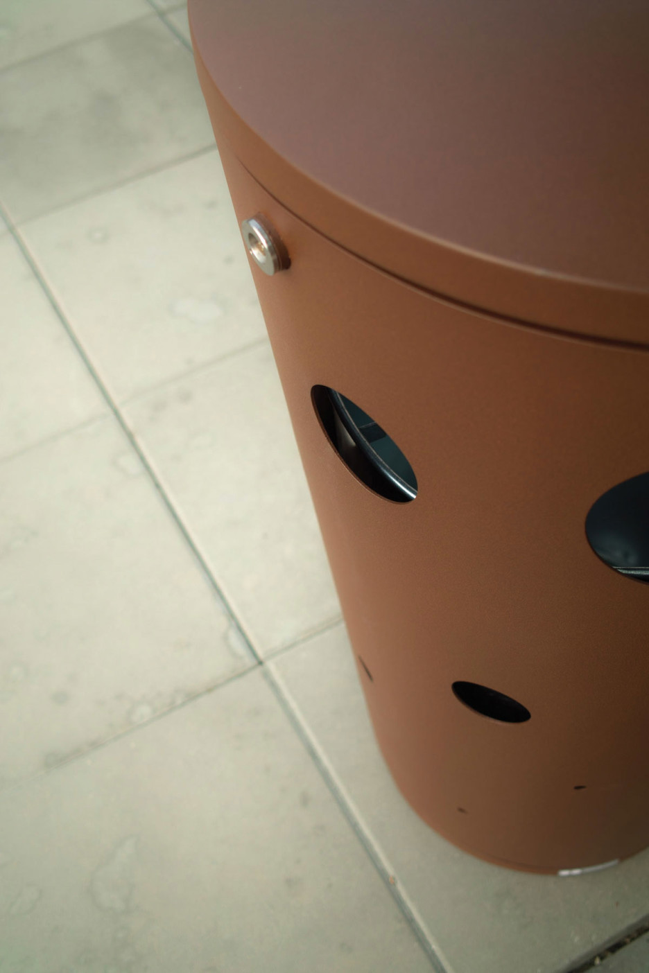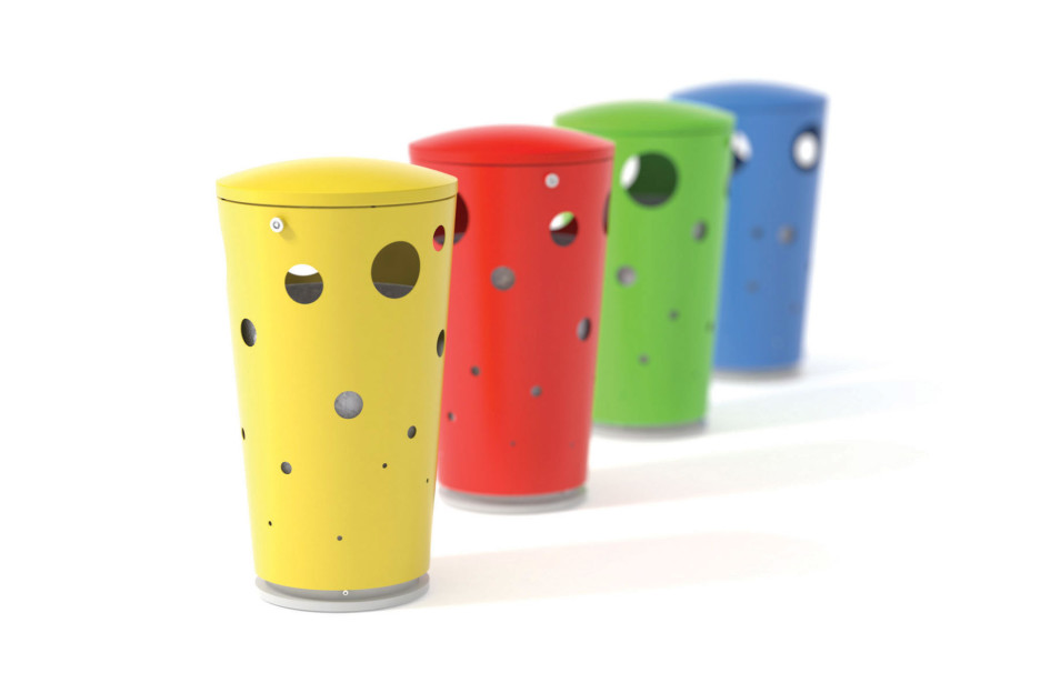 Karakteristisk avfallsbeholder med hullmønster og runde former.