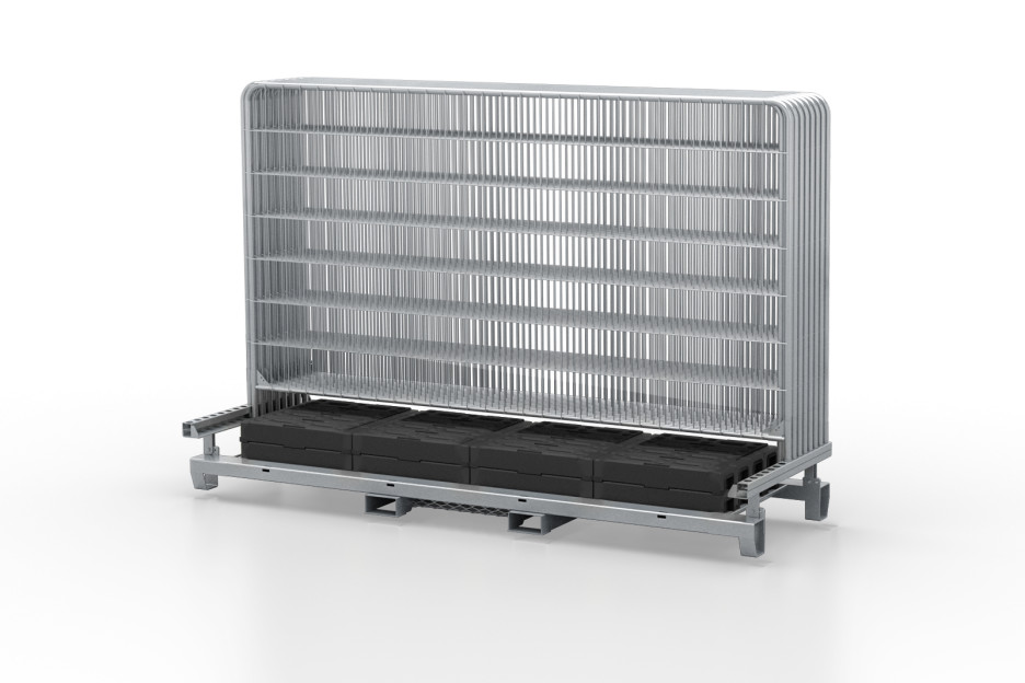 Komplett pakke inneholder: 30 stk anleggsgjerder, 30 stk klammer, 30 stk plastfundamenter og pall