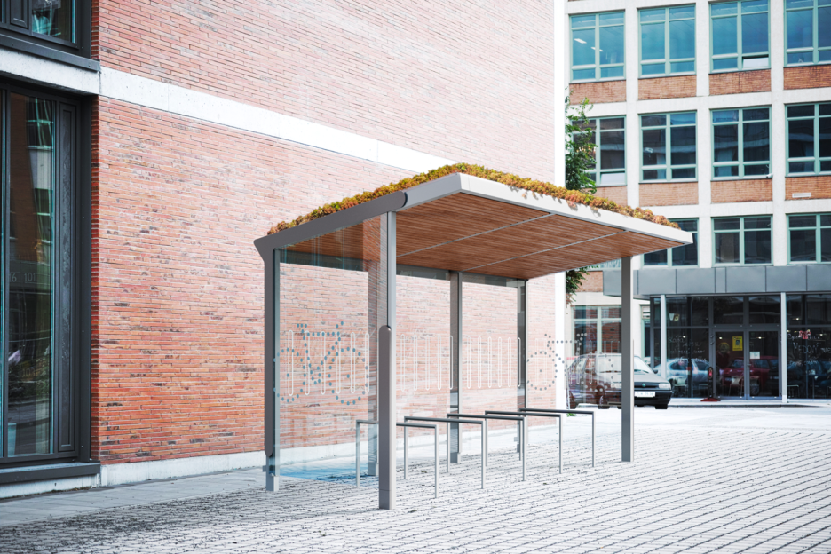 Galvanisert stål med pulverlakkering. Bak- og sidevegger av herdet glass med sykkel-piktogram, av trespiler i lerk eller av strekkmetal plater.