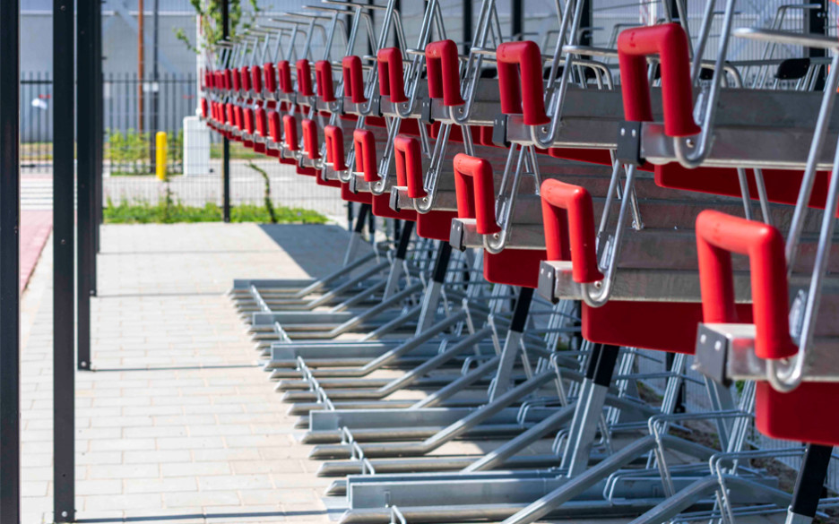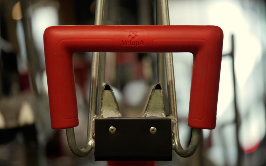 Designet er robust i galvanisert stål og med røde, kantede håndtak.