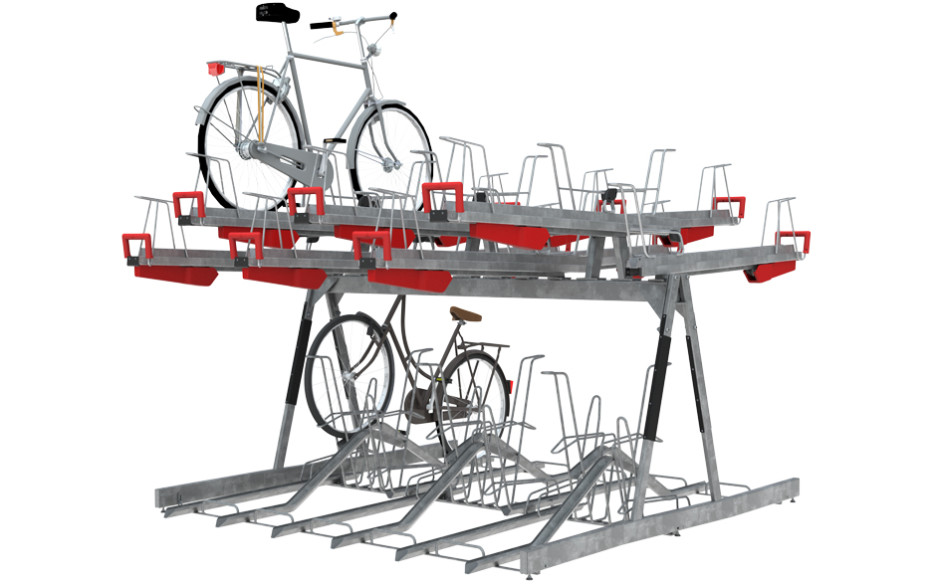 Systemet benytter integrerte gassfjærer som hjelper deg med å løfte sykkelen opp på det øverste parkeringsnivået. Et unikt system med dempere gir en sikker, kontrollert og håndfri nedtaking når du skal ha igjen sykkelen. Dette gjør det mye lettere å parkere sykkelen på det øverste nivået.