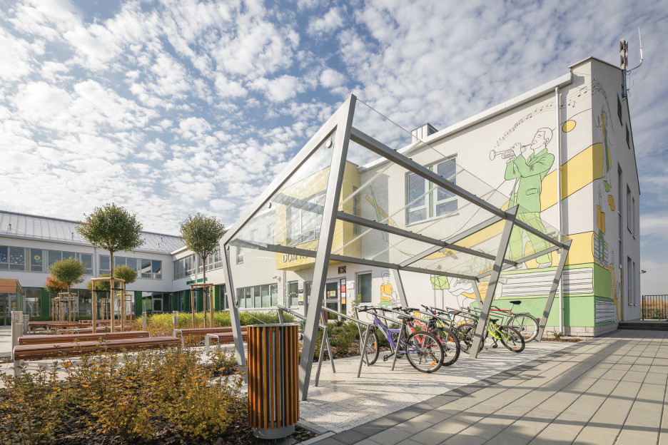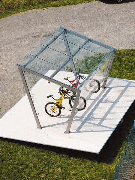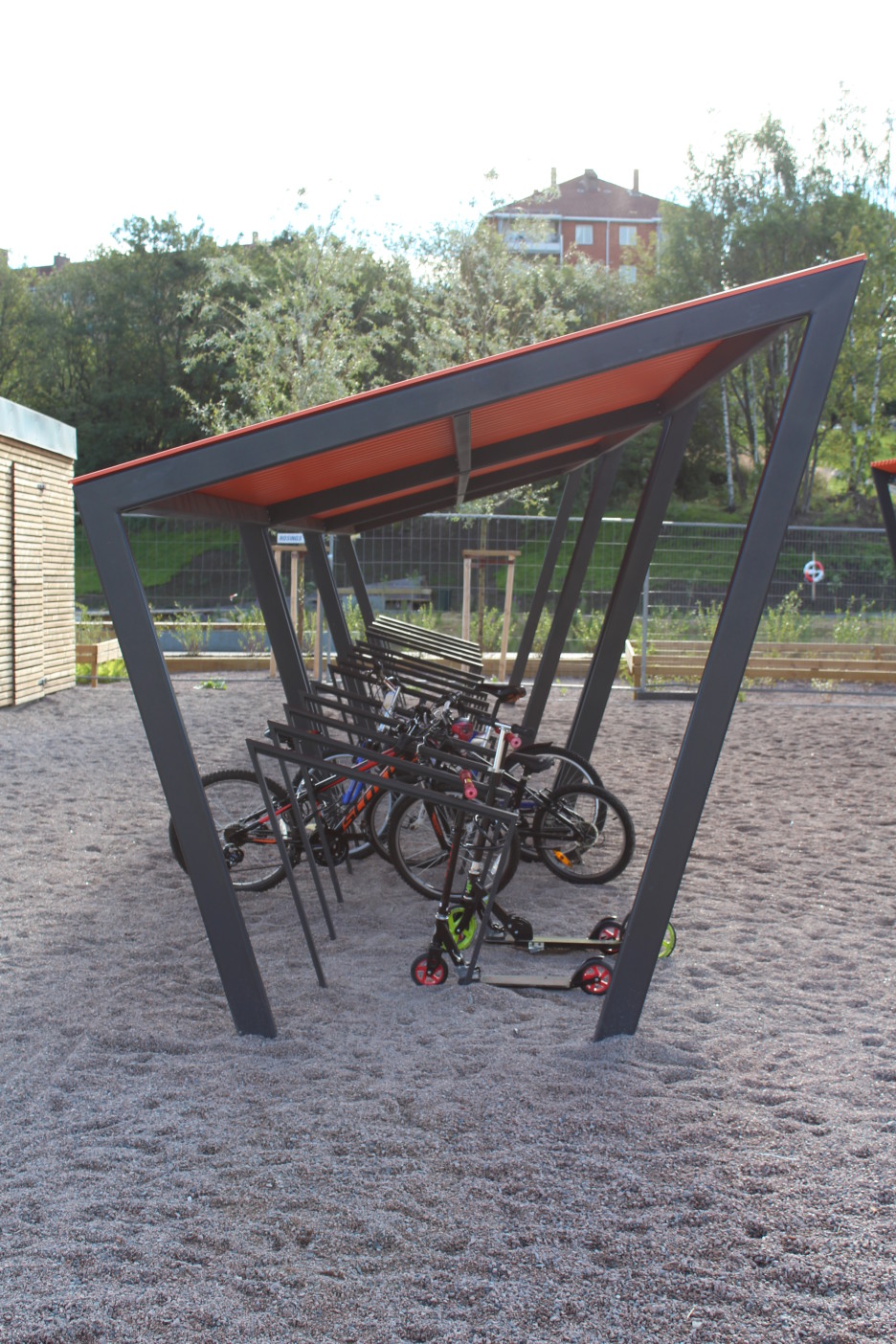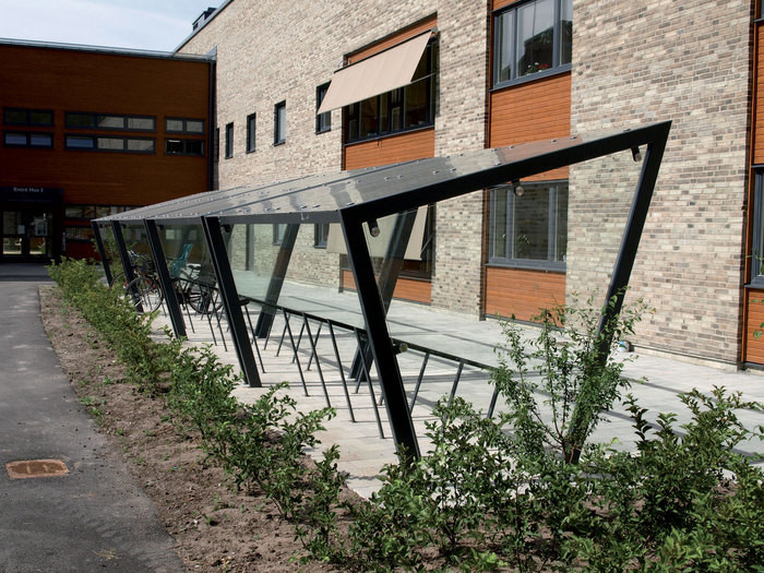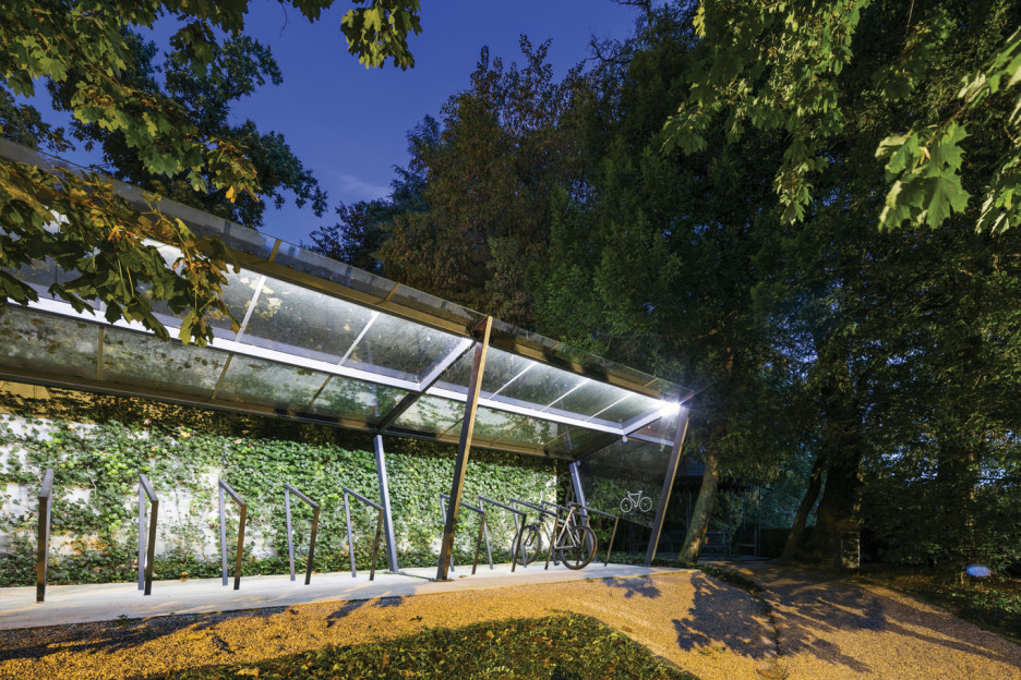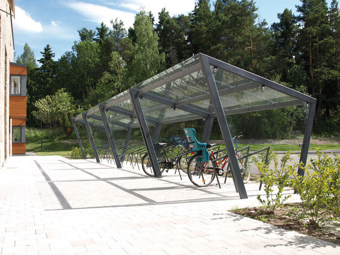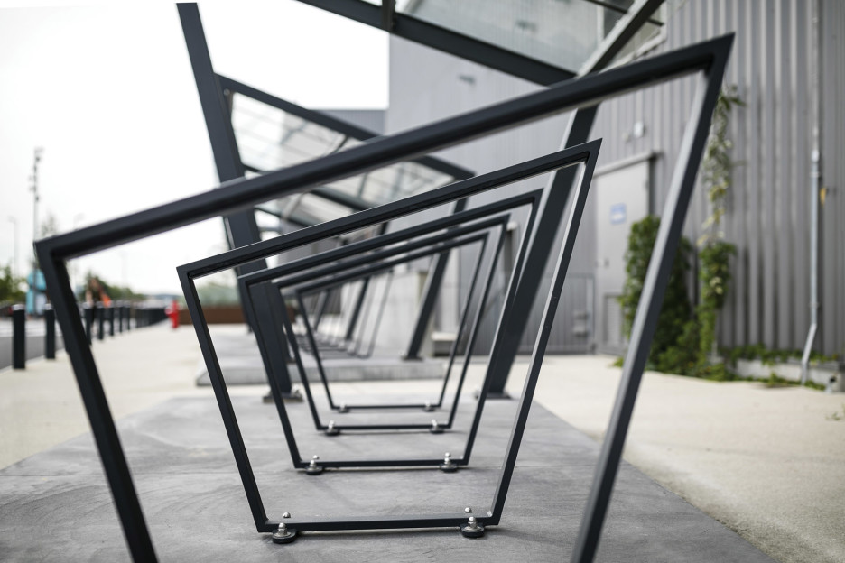 EDGE sykkeloverdekning har en elegant og dynamisk form. Robust ramme i kombinasjon med glass skaper en interessant kontrast og ly for syklene.