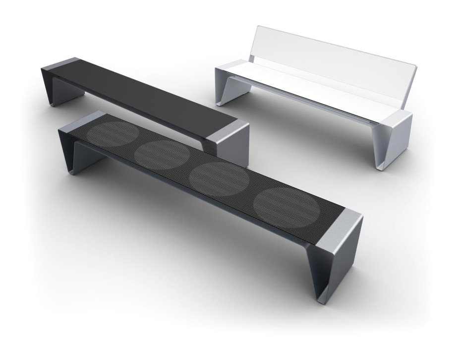 Designet på Radium-benkene er basert på estetikken fra linjene til elegant bøyde 5 mm tykke stålplater på vangene og rammene.