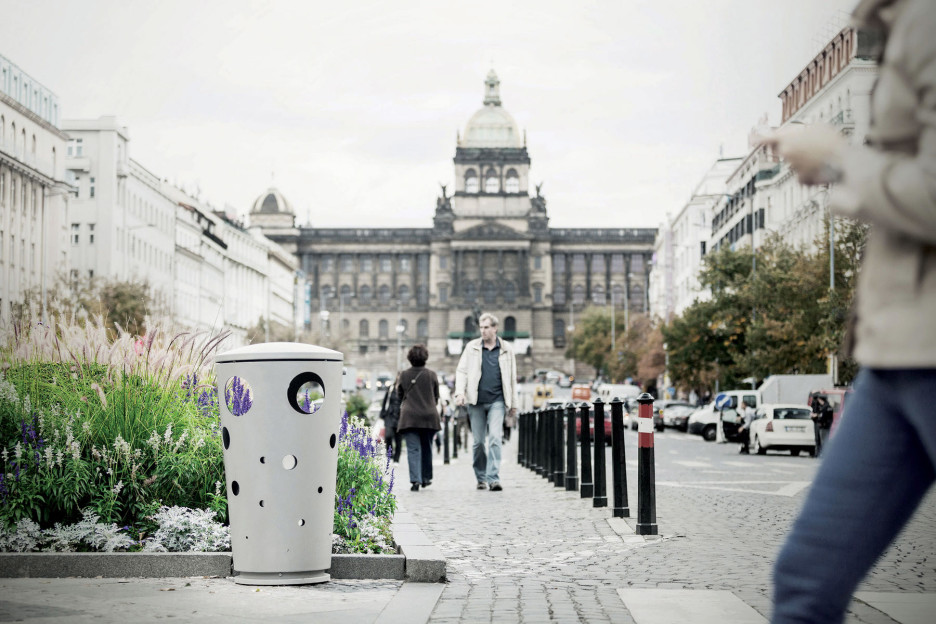 Karakteristisk avfallsbeholder med hullmønster og runde former.